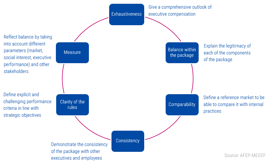 The objective is not only to be transparent regarding executive compensation, but rather to build a consistent, comprehensive compensation strategy. The six principles defined by the AFEP-MEDEF code (see chart below) can be helpful for companies willing to explain their compensation policy (for executives and employees).