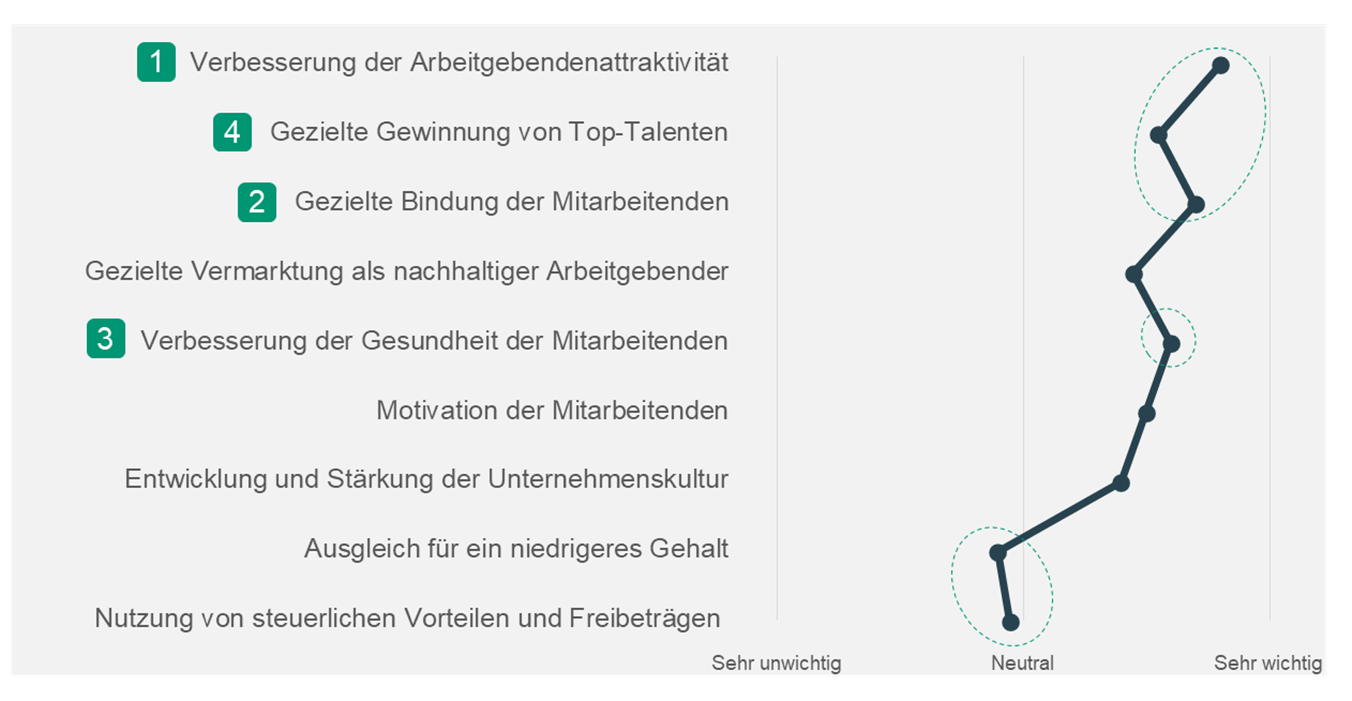 Mit einem attraktiveren Benefit-Portfolio versuchen die Branchenunternehmen vor allem die generelle Arbeitgeberattraktivität, die bessere Gewinnung und Bindung von Mitarbeitenden sowie eine erhöhte Gesundheit der Beschäftigten zu erzielen. Die Nutzung von Steuervergünstigungen und Freibeträgen mancher Benefits ist für die befragten Unternehmen ein positiver Nebeneffekt, aber nicht das Hauptmotiv in der Benefit-Strategie (siehe Abbildung).