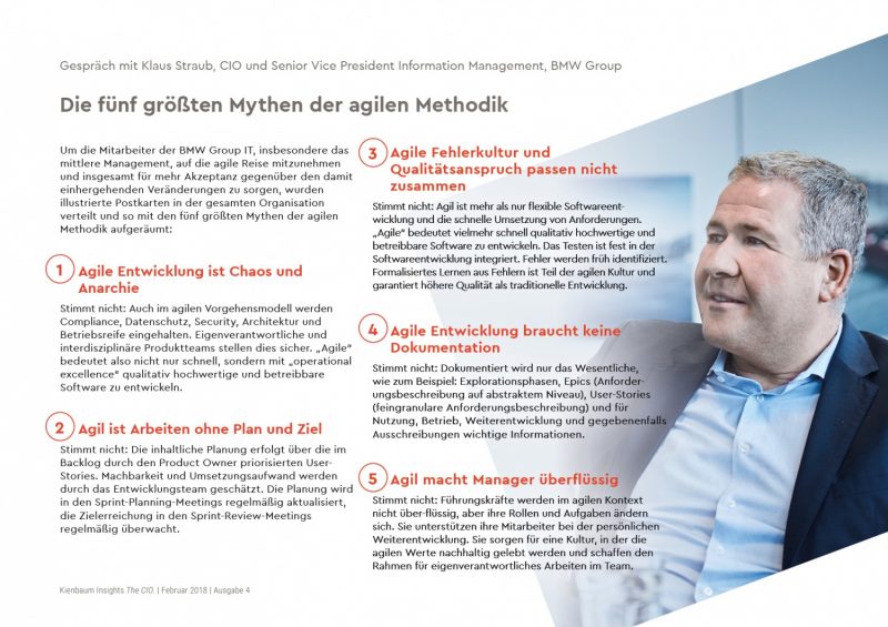 Es ist sogar im Gegenteil mit enormen Schnelligkeits- und Flexibilitätsverlusten zu rechnen. Nicht zu unterschätzen ist darüber hinaus die Bedeutung von guten Leuten, die die richtigen Kompetenzen mitbringen und zum Beispiel in der Lage sind, Software zu entwickeln. Wir profitieren an dieser Stelle von der Strahlkraft der Marke BMW, die für Innovation und ein tolles Produkt steht sowie von unserem enorm attraktiven IT-Standort. Es ist also ratsam, innovatives Talent Management zu betreiben und das eigene Unternehmen als attraktiven Arbeitgeber zu positionieren, um sich im postulierten Wettbewerb um IT-Fachkräfte durchzusetzen. Daneben braucht es vor allem Mut und Vertrauen, die Verantwortung in die Organisation reinzugeben. Das zahlt sich aus eigener Erfahrung allerdings schnell aus. Mir wurde seit der Umstellung auf agil immer wieder aufgezeigt, wozu die eigene Mannschaft fähig ist. Wir geben mit diesem Schritt der IT die IT zurück. Das macht mich stolz.