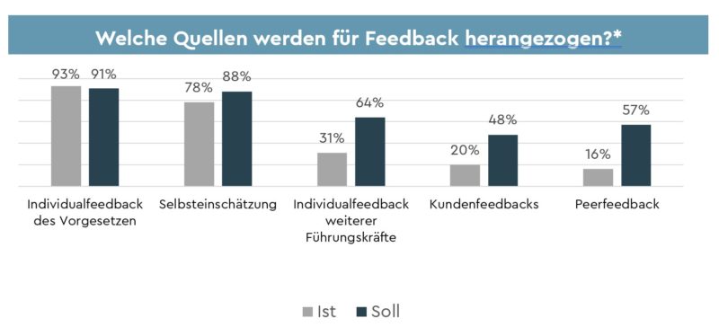 Mitarbeiter:innen-Gespräche basieren bisher hauptsächlich auf der Sichtweise der Führungskraft und der Selbsteinschätzung des Mitarbeitenden. Die Umfrage offenbart jedoch einen klaren Wunsch nach einem breiteren Kreis von Feedbackgebenden, insbesondere in Unternehmen, in denen viel in Projektteams oder agilen Strukturen gearbeitet wird. Hierbei zeigt sich die Bedeutung, verschiedenste Personengruppen in den Feedbackprozess zu integrieren, die ausreichend Kontakt mit den betreffenden Mitarbeiter:innen hatten, um qualifizierte Rückmeldungen geben zu können. Damit solche Formate ein faires und aussagekräftiges Feedback liefern können, ist es wichtig, dass Unternehmen sich Gedanken über die Steuerung der Prozesse, die Häufigkeit, die abgefragten Inhalte und die möglichen Konsequenzen aus dem Feedback verschiedener Personengruppen machen.