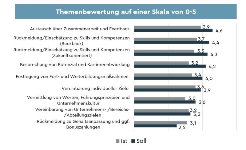 Nach wie vor wird die Erreichung von KPIs, Ergebnissen und Zielen wesentlicher Teil der Leistung, des Feedbacks und den Entscheidungen zu Gehalt und Karriere im Performance Management sein. Doch die Erfüllung von erwarteten Kompetenzen und Skills werden als immer gewichtigere Indikatoren von Leistung eingeschätzt, da sie wesentlich für den nachhaltigen Aufbau von Performance und Motivation sind. Insofern folgerichtig die zunehmende Intention über diese Inhalte in den Mitarbeiter:innen-Gesprächen Entwicklung und Motivation anzusteuern. Der Wunsch, sich mehr über Zusammenarbeit und Feedback auszutauschen oder die Besprechung von Karriereentwicklungen im Mitarbeiter:innen-Gespräch, ist weit stärker ausgeprägt als Aspekte wie Zielvereinbarungen oder Gehaltsanpassungen zu thematisieren. Diese werden dann an anderer Stelle adressiert und der einstmals prominenten Bedeutung im Mitarbeiter:innen-Gespräch enthoben.