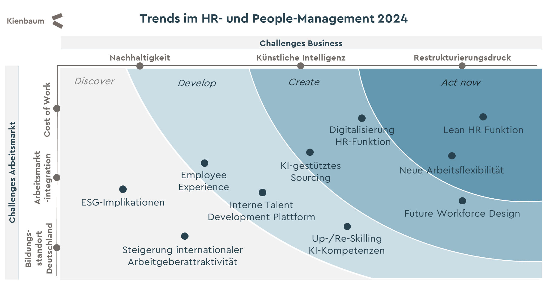 Zusätzlich stehen Unternehmen vor der Aufgabe, auf den Klimawandel zu reagieren, auf Regulierungen vorbereitet zu sein und die Integration von Nachhaltigkeit als zentralen Bestandteil ihrer Geschäftspraktiken zu etablieren. Gleichzeitig nehmen die Entwicklungen am Arbeitsmarkt enormen Einfluss auf die Personalarbeit: Andauernde Arbeitskräfteknappheit, steigende Cost of Work sowie Anforderungen in der Arbeitsmarktintegration und die strategische Positionierung Deutschlands als Bildungs- und Wirtschaftsstandort stellen akute People-Risiken für die Unternehmensentwicklung dar, die es zu managen gilt.