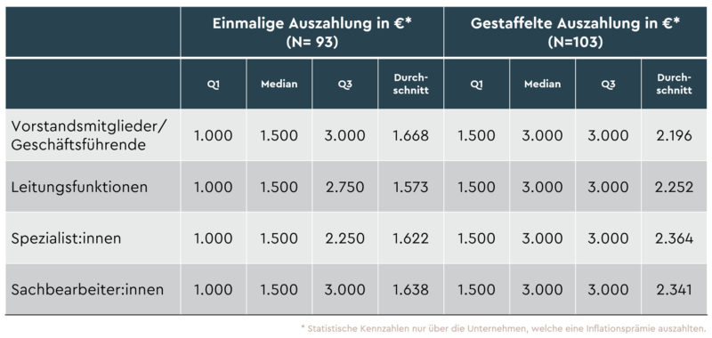 Nur etwa ¼ der befragten Unternehmen, welche eine Inflationsprämie auszahlten, zahlten den vollen Betrag aus. Der durchschnittliche Auszahlungsbetrag lag bei etwa 2.200€.