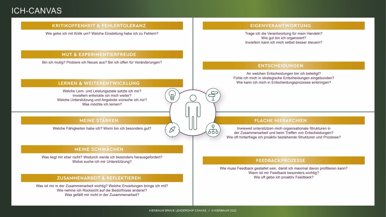 Sie werden eingeladen, mithilfe des Ich-Canvas einen Blick in Ihr Inneres zu werfen, sich eigener Stärken und Schwächen, Gewohnheitsmuster und Verhaltensweisen bewusst zu werden und sich selbst besser kennenzulernen.