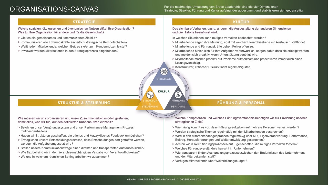 Mithilfe der Leitfragen im Organisations-Canvas können Sie gemeinsam mit Ihrem Management-Team reflektieren, wie stark Brave Leadership schon in Ihrer Organisation verankert ist, und Maßnahmen ableiten, um es voranzutreiben.