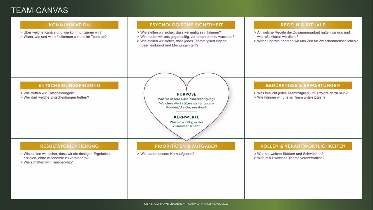 Gemeinsam mit Ihrem Team können Sie das Team-Canvas nutzen, um anhand der gezielten Fragen Ihre Zusammenarbeit zu reflektieren und herauszuarbeiten, wie Brave Leadership auf Team-Ebene gestärkt werden kann. Einen geeigneten Rahmen hierfür bietet ein Team-Workshop.